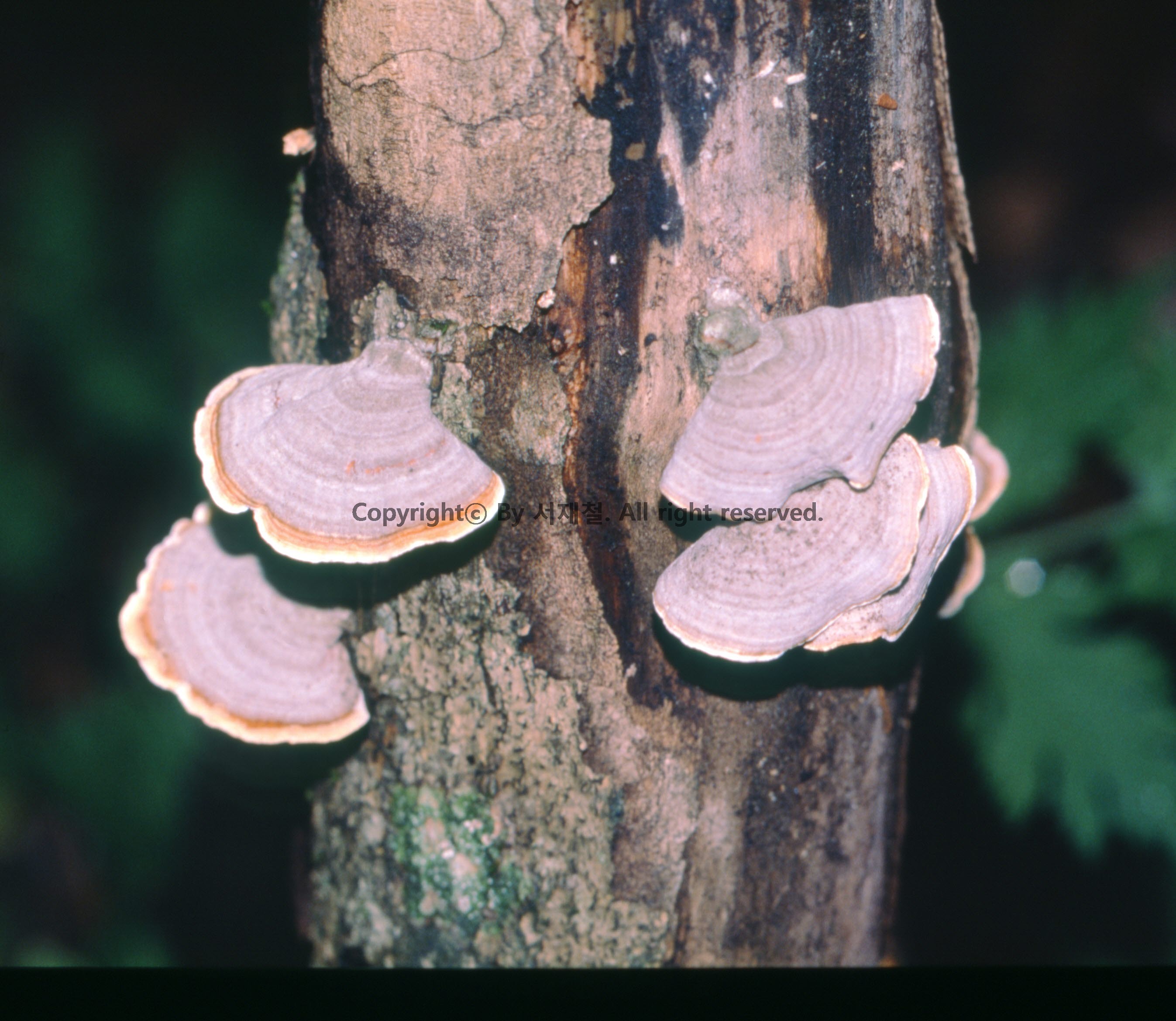 1년 내내 활엽수의 고목이나 줄기에 중첩하여 나는 반원 모양 백색 부후균이다. 팡이갓은 조개껍질 모양이고 밑은 가늘게 되어 있다. 가죽질이 거북손처럼 자라고 등을 마주한다. 털이 있는 곳과 털이 없는 곳이 고리무늬를 만들며, 털이 있는 부분은 쥐색이고 털이 없는 부분은 등황색 또는 황갈색이다.
