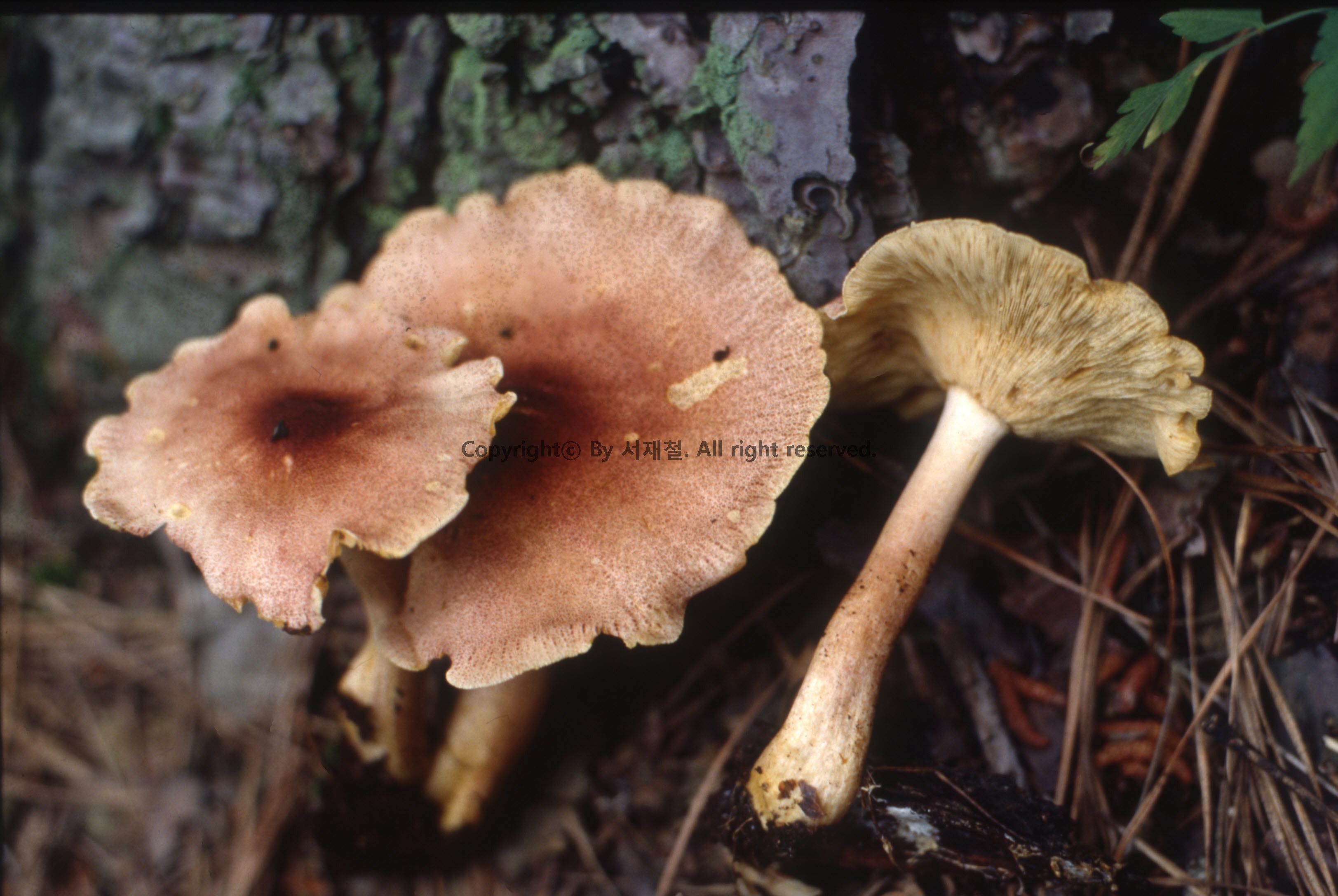 여름부터 가을 사이에 산지 침엽수 그루터기나 썩은 나무 위에서 둥근 황색 버섯이 한두 개 씩 난다. 팡이갓은 종 모양에서 넓고 평평하게 된다.