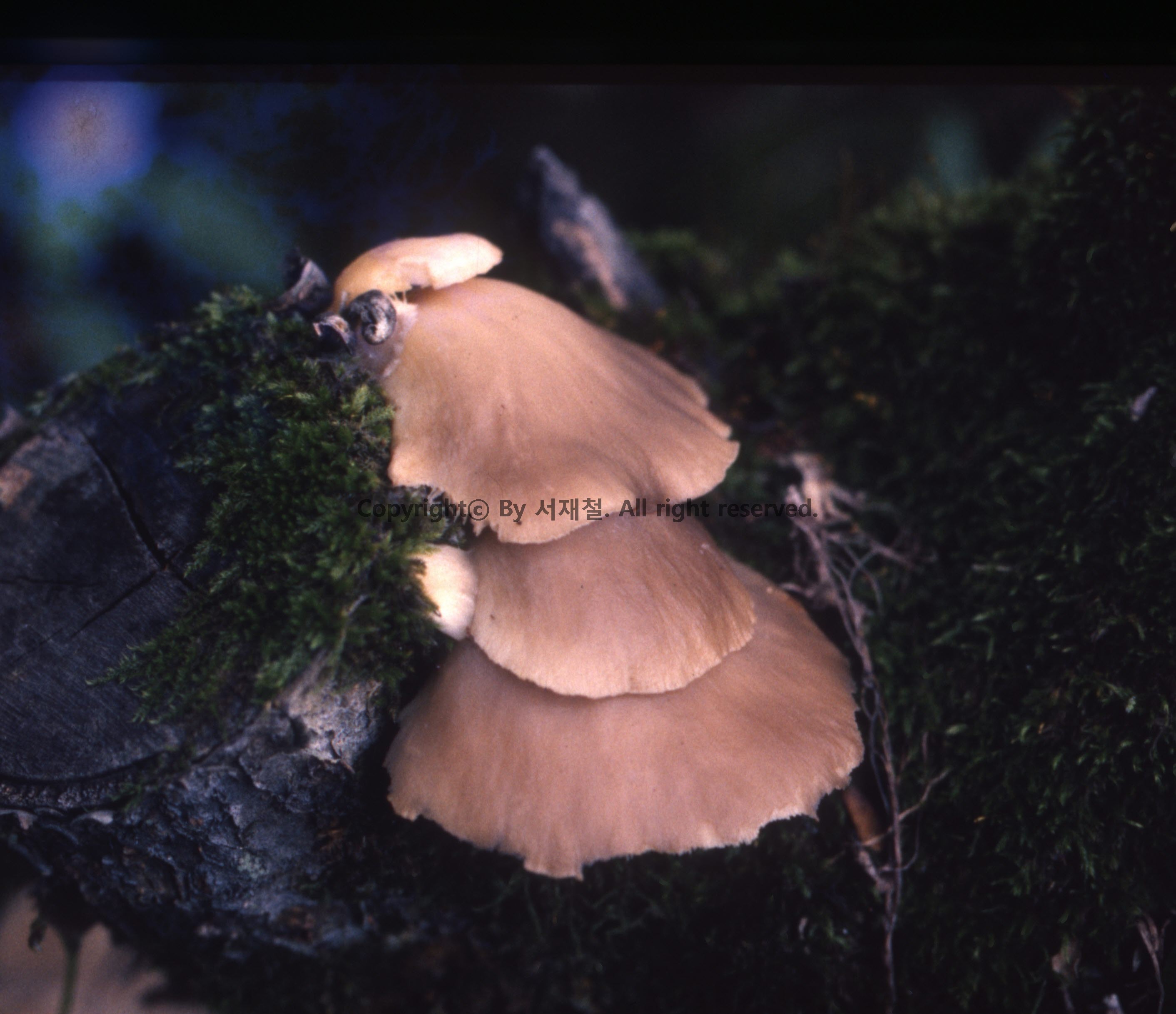 가을철에 산지의 활엽수 고목 특히 졸참나무나 너도밤나무 등에 붙어 반원 모양의 버섯이 모여난다. 팡이갓의 지름은 5~10cm로 반원 모양이며, 겉은 끈기가 있고 자갈색 또는 자황갈색이다.