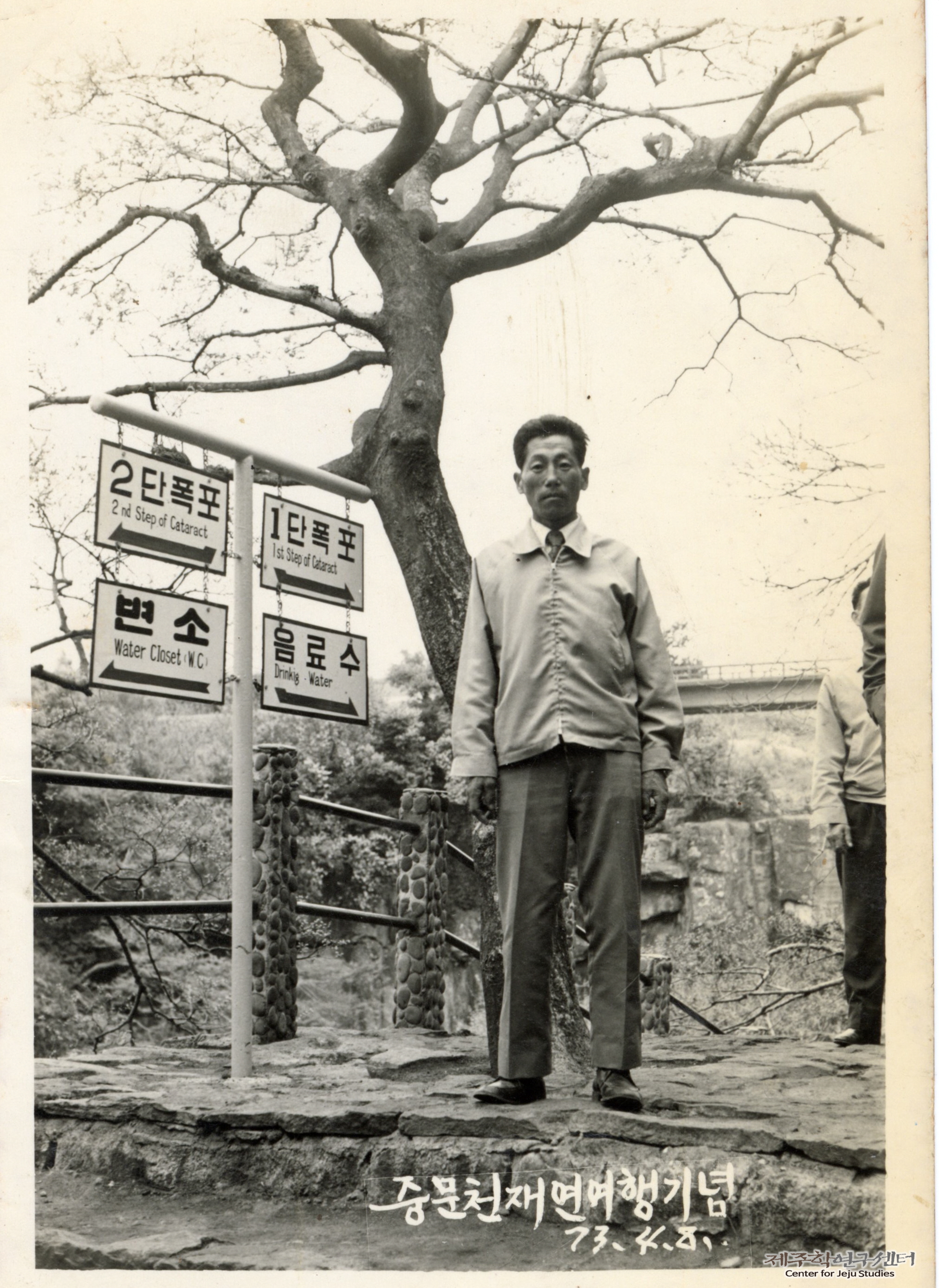 마을 부부 동반 야유회 기념으로 촬영한 사진으로 소장자 강남승 씨가 중문 천제연 안내판 앞에 서 있다. 편의시설(변소, 음료수)과 폭포 이정표(2단폭포와 1단폭포)가 함께 담긴 안내판이 폭포 입구에 세워져 있었다. 사진 하단에는 '중문천재연여행기념 73. 4. 8.'이라고 적혀 있다.