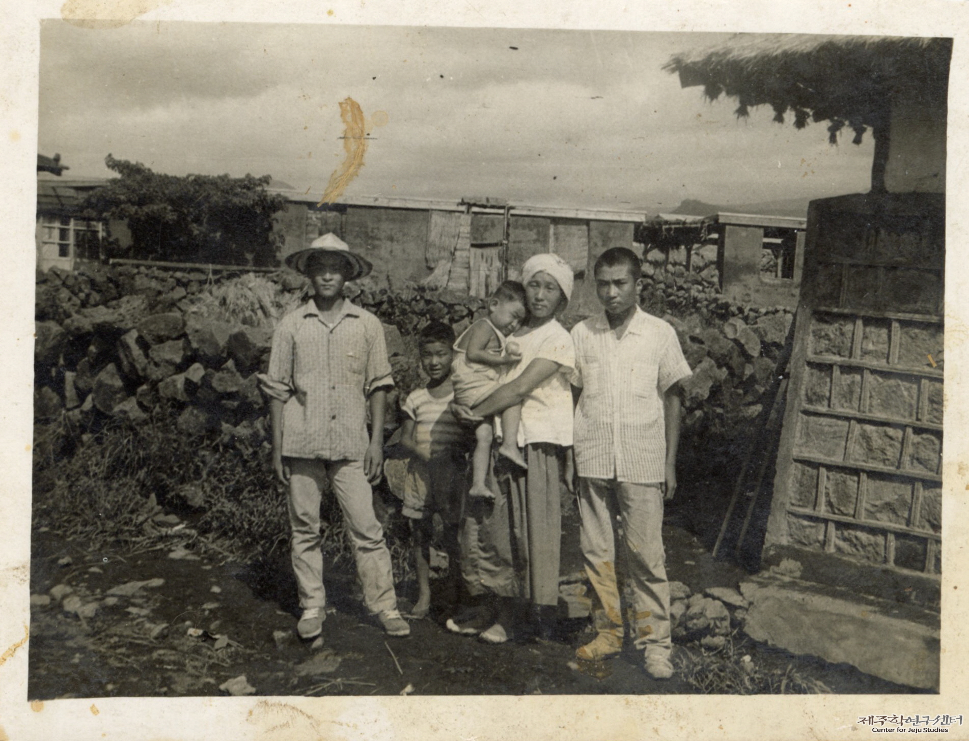 김원출 씨 친척들이 일을 마치고 애월읍 수산리에서 촬영한 사진이라고 한다. 인물 주변에는 당시 변화되는 집들의 모습이 보인다.