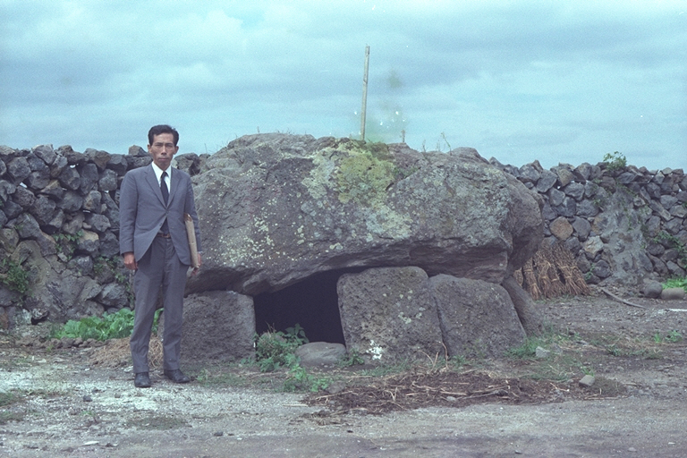 * 개요 : 용담동 고인돌6호는 제주시 용담2동 2632-1번지에 위치해 있다. 1971년 8월 26일 제주도 기념물 제2-6호로 지정된 후, 2012년 5월 17일 용담동 유적과에 통합되어 국가사적 제522호로 지정되었다. 고인돌은 청동기 시대의 대표적인 무덤으로 주로 경제력이 있거나 정치권력을 가진 지배층의 무덤으로 알려져 있다. 용담동 고인돌은 땅 속에 무덤방을 만들고 작은 받침돌을 세운 뒤 그 위에 덮개돌을 올린 바둑판식으로 평지에 자리하고 있다. 덮개돌의 길이는 315㎝, 폭 217㎝, 두께 105㎝이며, 장축은 정남북방향이다. 받침돌은 잘 다듬어진 판석 11매로 덮개돌 가장자리를 돌아가며 병풍처럼 고여 있다. 무덤방은 지상에 마련되어 있는데 길이 160㎝, 폭 100㎝로 땅을 파고 바닥에 자갈을 얇게 깔았으며 테두리는 깬돌을 이용하여 돌상자 모양으로 만들었다. 용담동 고인돌 6호는 외형은 바둑판식인데, 지상에 무덤방을 마련한 것으로 보아 제주도 고인돌 중 특수형에 속한다. 고인돌 앞에 당시 일본 학자를 안내하며 함께 조사를 했던 故 현용준 교수가 서서 포즈를 취하고 있다.