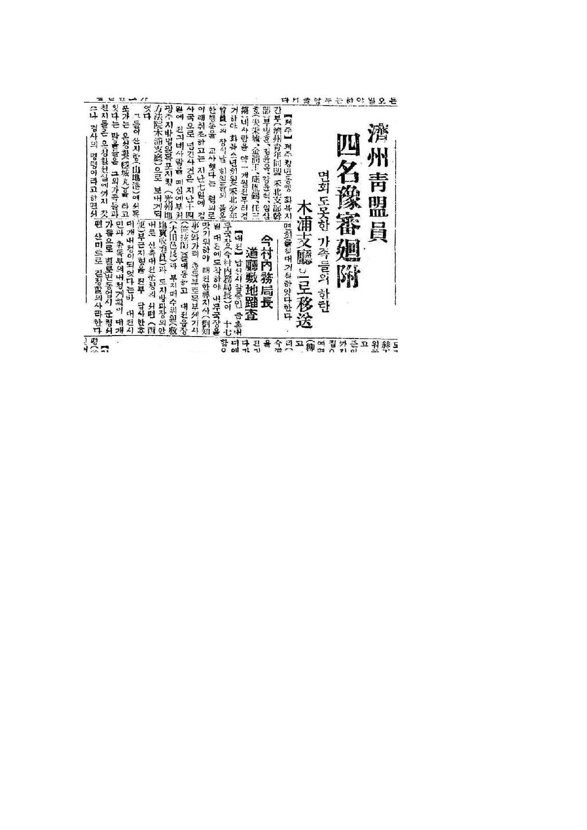 【제주】 제주청년동맹(濟州靑年同盟) 화북지부 간부(禾北支部 幹部) 부병훈(夫秉壎) 김윤옥(金潤玉) 강윤석(康胤錫) 임삼호(任三鎬) 네사람을 약일(一)개월 전부터 검거하야 화븍 소년회원(少年會員)의 장식날 회원들의 불온한 행동을 교사햇다는 혐의로 이래 취조하고는 지난 칠(七)에 검사국으로 넘긴 사건은 지난 십사(十四)일에 전긔 네사람을 예심에 부처 광주지방법원목포지청(光州地方法院木浦支廳)으로 보내게 되엇다 그들이 산지항(山池港)에서 목포가는 온성환(穩城丸)을 타고 잇다는 말을 들은 그의 가족들과 친지들은 온성환 선실에 까지 갓스나 검사의 명령이라고 하면서 면회를 절대 거절하얏다고 한다