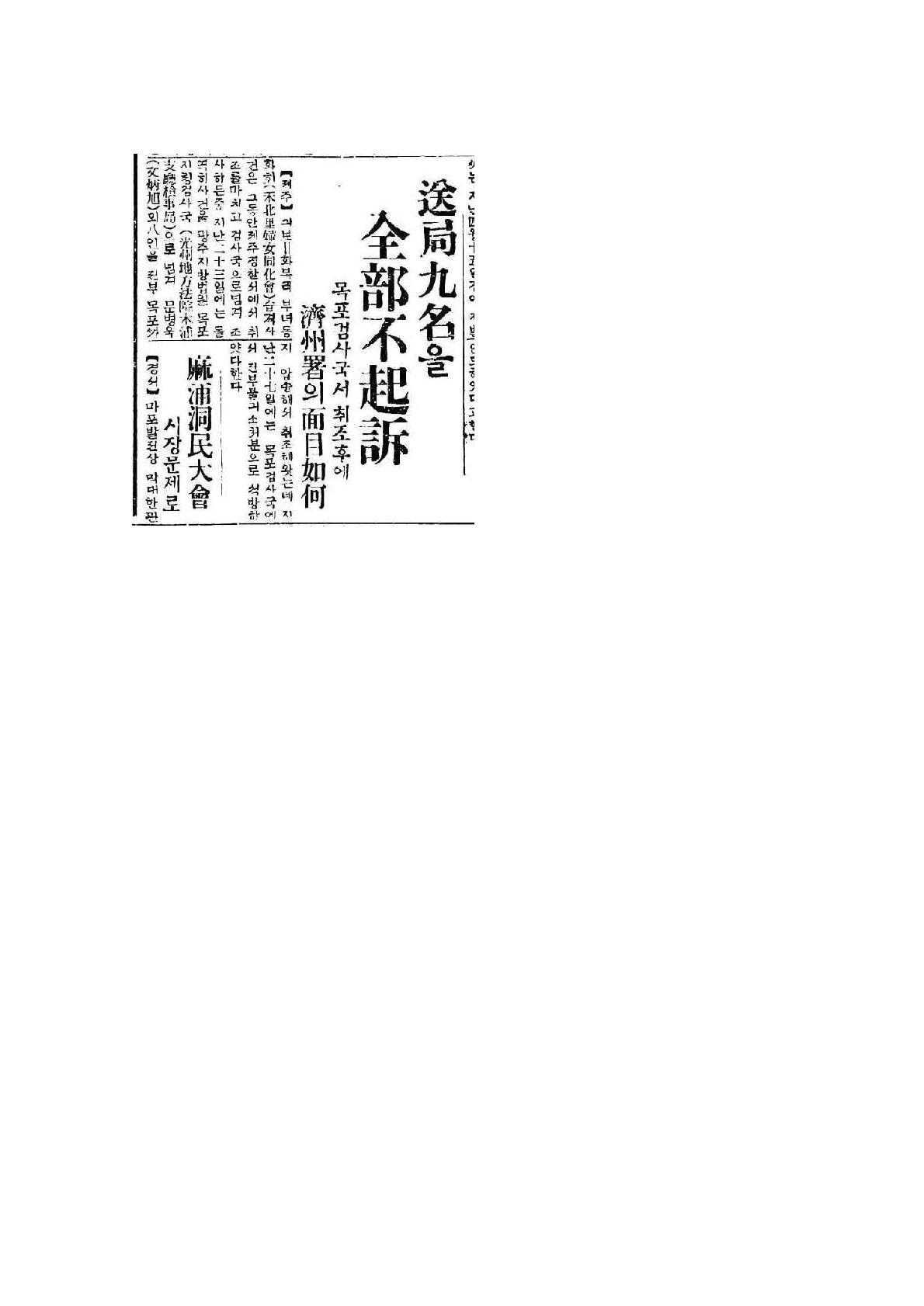 【제주】 화븍리부녀동화회(禾北里婦女同化會) 습격사건은 그동안 제주경찰서에서 취조를 마치고 검사국으로 넘겨 조사하든중 지난 이십삼(二十三 )일에는 돌역히 사건을 광주지방법원목포지청검사국(光州地方法院木浦支廳檢事局)으로 넘겨 문병욱(文炳旭)외 팔(八)인을 전부 목포까지 압송해서 취조해왓는데 지난 이십칠(二十七)일에는 목포검사국에서 전부 불긔소처분으로 석방하얏다한다