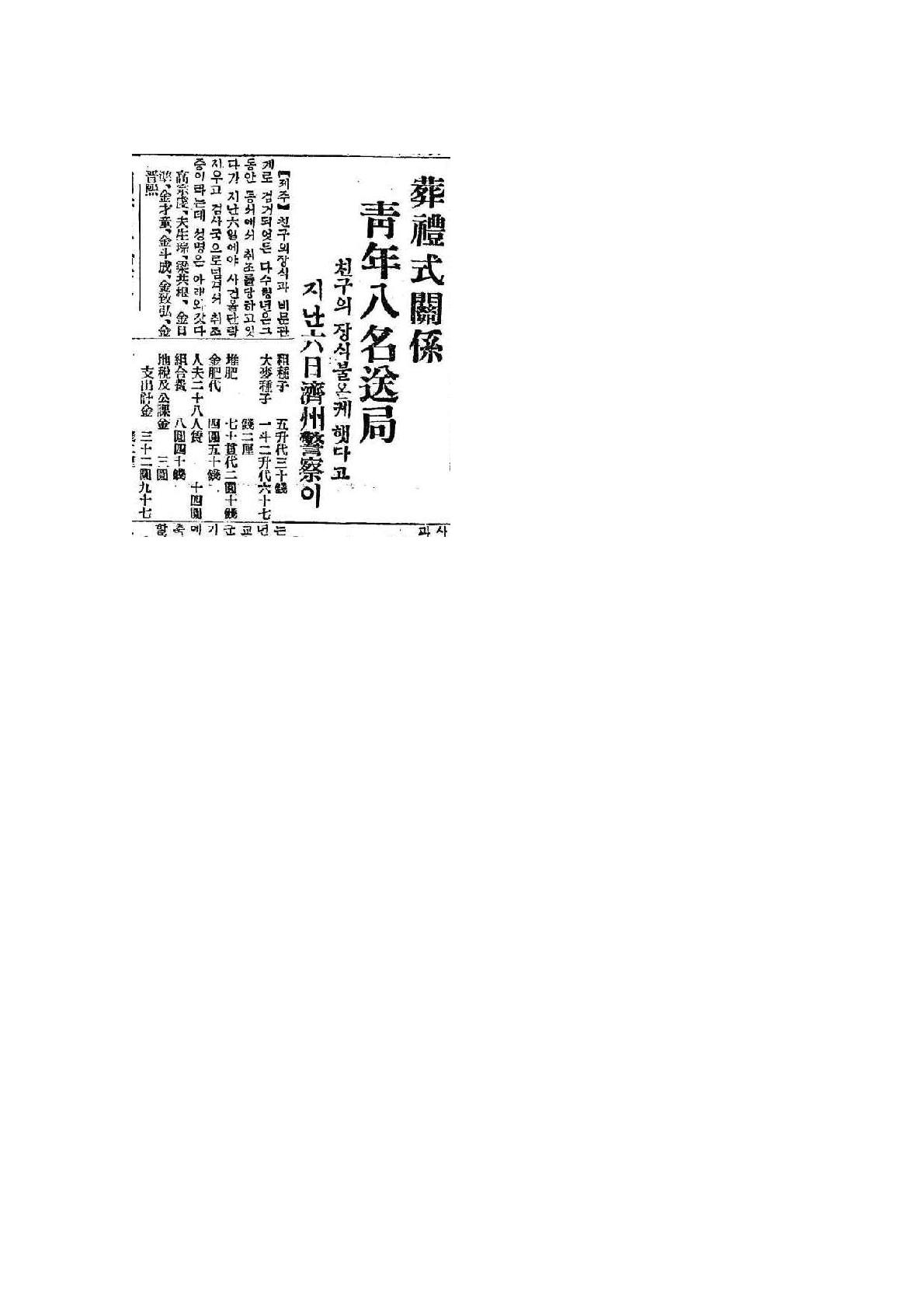 【제주】 친구의 장식과 비문관게로 검거되엇든 다수청년은 그동안 동서에서 취조를 당하고 잇다가 지난 육(六)일에야 사건을 단락지우고 검사국으로 넘겨서 취조중이라는데 성명은 아래와 갓다