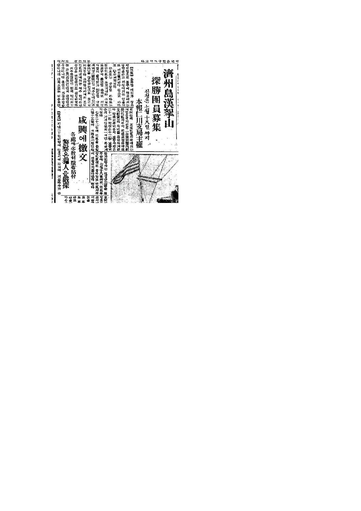 산으로는 금강산 바다로는 원산 인천등도 잇거니와 그보다도 교통이 불편한 관계로 세상사람의 발자최가 희할한 남도의 비경(祕境)인 제주한내산(漢拏山)을 탐승하는것도 물론 의의가 잇다 그러한 의미에서 본보인천지국에서는 제주 한내산탐승단을 모집하기로 결정하엿다 제주로 말하면 멀리 떨어저잇는 고도(孤島)인만치 특별한 경우가 아니면 졸연히 가볼수 업슬뿐 아니라 단독으로는 비용도 만히 되는데 본보인천지국에서는 긔업동맹기선부(企業同盟汽船部)인천지부에 특별교섭하야 선임(船賃)과 식비를 특히 싸게 하야 왕복전부비용이 보통사람은 이십일(二十一)원 학생은 십삼(十三)원 보통비용의 삼분의 일(一 )이면 족하게 되엇다 칠(七)월 이십이(二十二)일에 인천을 출발 팔(八)월십오(十五)일에 도라올 예정인데 참가희망자는 신청금 삼(三)원을 첨부하야 칠(七)월십팔(十八)일까지 인천부상인천역전 동아일보 인천지국에 신청하기를 바란다 한다