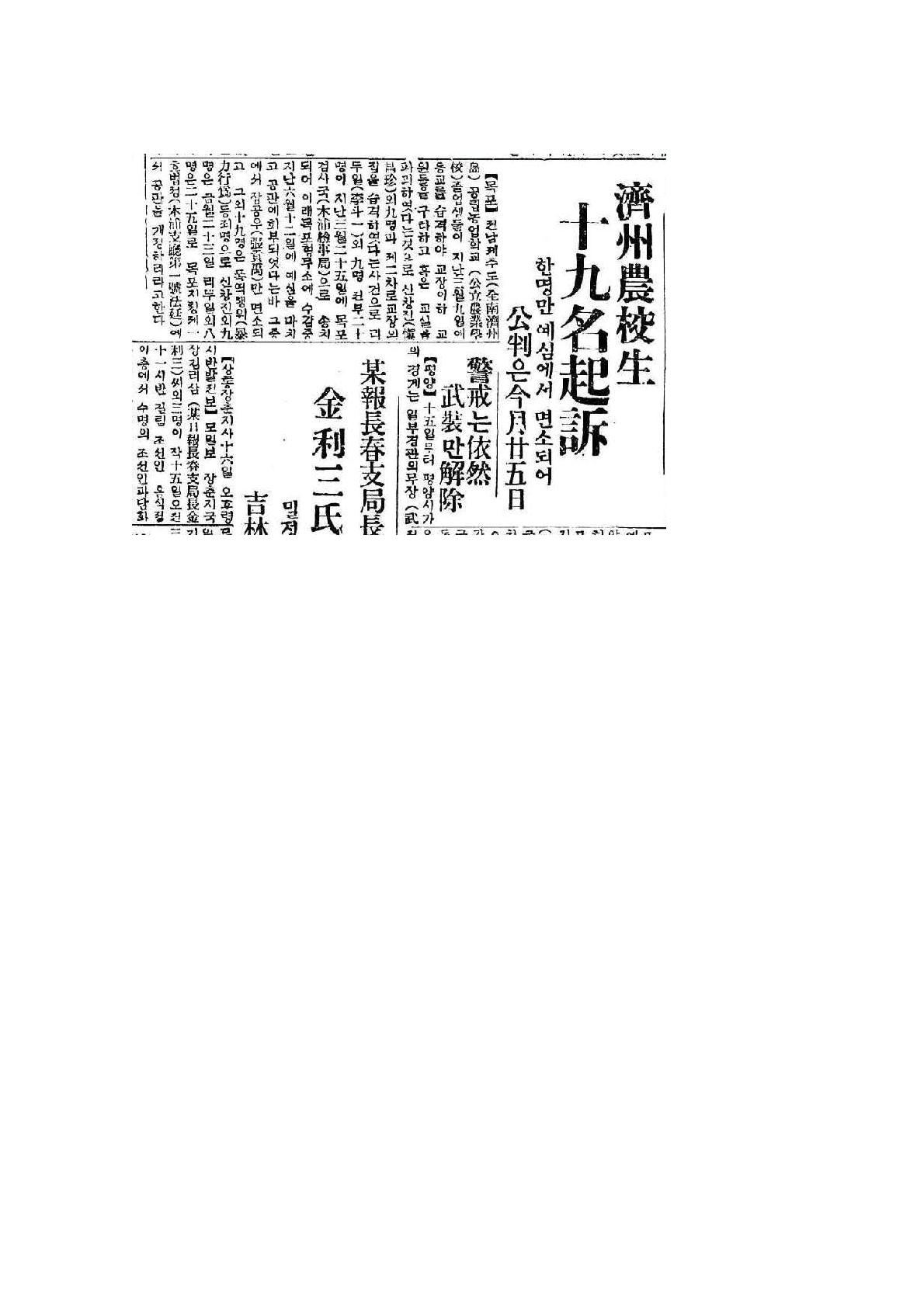 【목포】 전남제주도(全南濟州島)공립농업학교(公立農業學校)졸업생들이 지난 삼(三)월구(九)일에 동교를 습격하애 교장이하 교원들을 구타하고 혹은 교실을 파괴하엿다는 것으로 신창진(愼昌珍)외 구(九)명과 제이((二)차로 교장의 집을 습격하얏다는 사건으로 리두일(李斗一)외 구(九)명 전부 이십(二十)명이 지난 삼(三)월이십오(二十五)일에 목포검사국(木浦檢事局)으로 송치되어 이래 목포형무소에 수감중 지난 육(六)월십이(十二)일에 예심을 마치고 공판에 회부되엇다는바 그중에서 장고우(張貢禹)만 면소되고 그 외 십구(十九)명은 폭역행위(暴力行爲)등 죄명으로 신창진외구(九)명은 금월 이십삼(二十三)일 리두일외 팔(八)명은 이십오(二十五)일로 목포지청 제일호법정(木浦支廳 第一號法廷)에서 공판을 개정하리라 한다