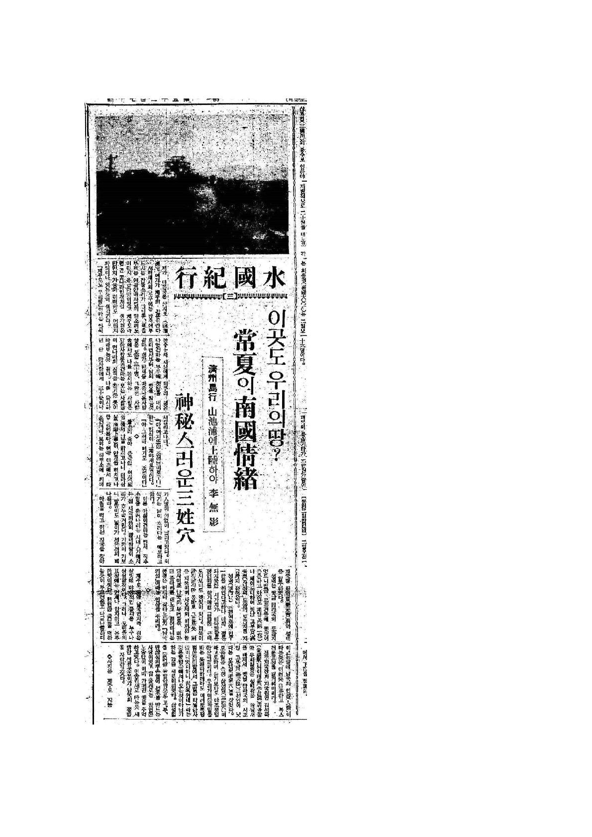 진주지국장과 지국원인 김석묵(金錫黙)씨 이태윤(李台潤)씨를 합한 우리일행은 성벽같은 돌담새를 빠저서 옛날 탐라국의 시조인 고부량(高夫良) 삼(三)선인이 낫다는 모흥혈(毛興穴)을 찾엇다. 모흥혈은 속칭 삼성혈(三姓穴)이라고도 하여 듣기보다도 아조 평범한 잔디밭이다. 우리가 이를 꼭 믿을 바는 못된다하더라도 이러토록 평범한 잔디밭에서 그만큼 탁월한 사람이 나엇다하니 항상 “위대”라는 것은 평범속에서 나오는 것이 아닌가 하는 감을 새로이 하엿다. 삼성혈을 둘러싼 돌담안밖으로 고, 부, 량 삼성의 후손들이 선조를 받드는 사당이 잇고 담 둘레로는 창연한 노송만이 이미 가버린 옛을 추억하고 잇다. 이송림새로 타는 듯 새빩안 석류꽃송이가 남국의 정렬을 자랑하고 잇다.