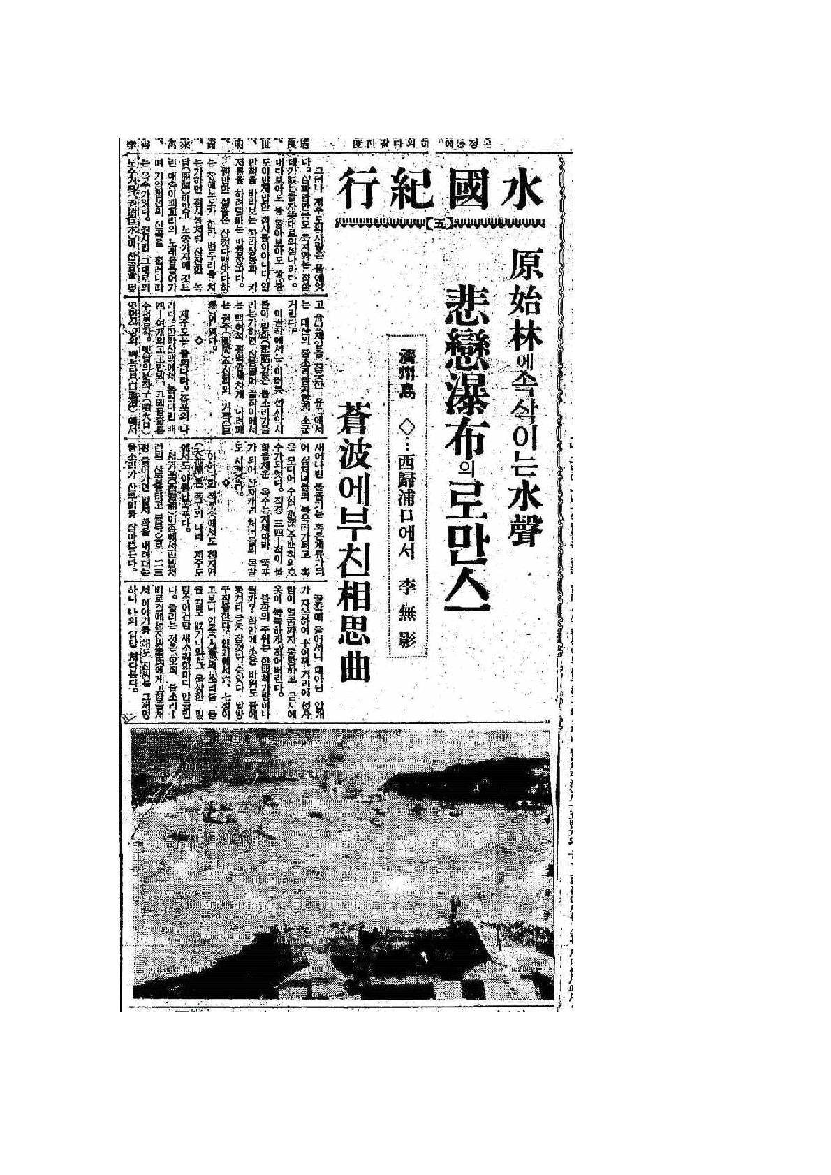 수국기행(水國紀行)(오(五)): 원시림(原始林)에 속삭이는 수성(水聲)비련폭포(悲戀瀑布)의 로만스(1935년 08월 05일) 2
