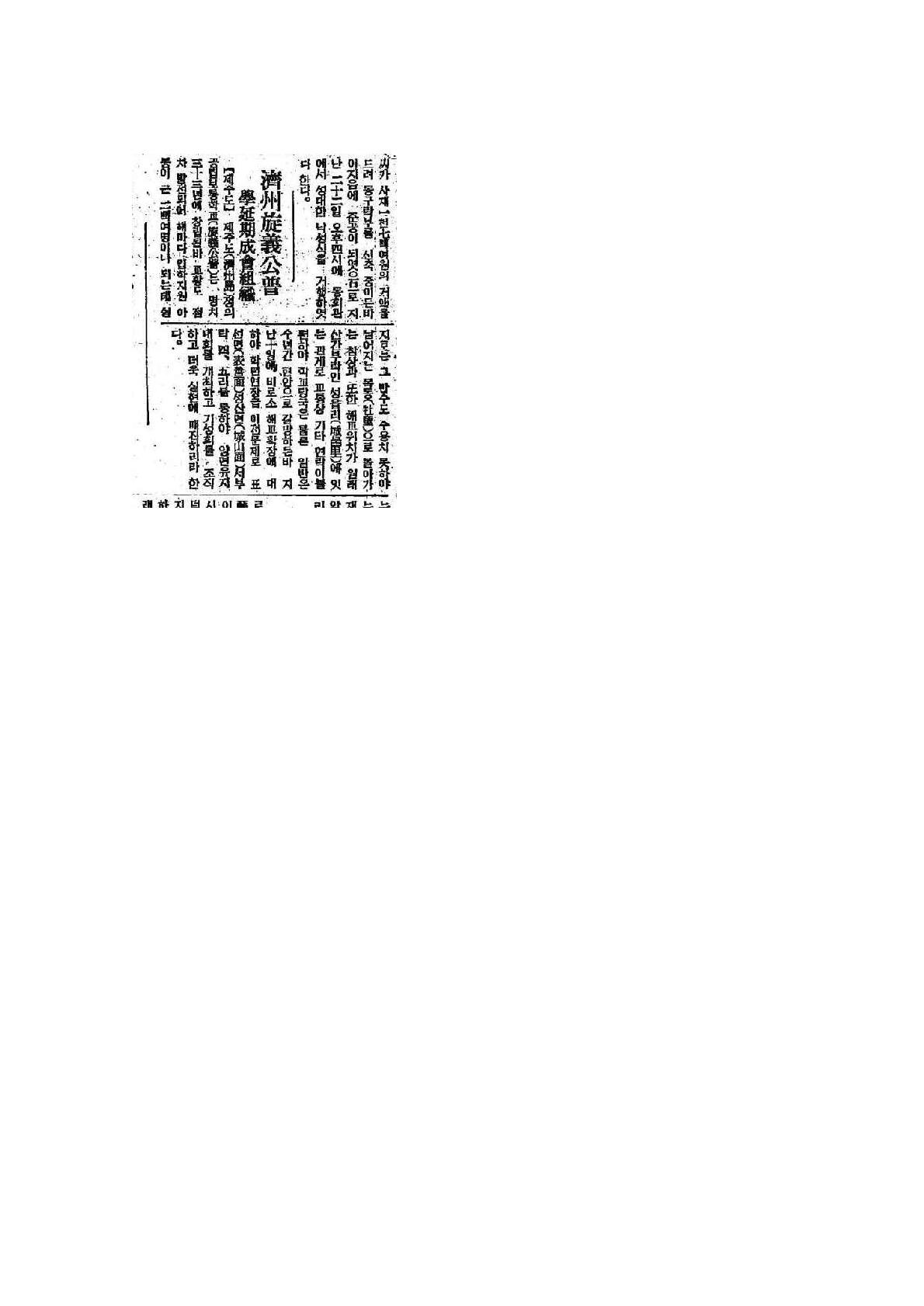 【제주도】 제주도(濟州島) 정의공립보통학교(선의공보(旋義公普))는 명치 삼십삼(三十三)년에 창립된바 교황도 점차 발전되어 해마다 입학지원 아동이 근 이(二)백여명이나 되는데 실지로는 그 반수도 수용치 못하야 나머지는 목동(牡童)으로 돌아가는 참상과 또한 해교위치가 원래 산간부락 성읍리(城邑里)에 잇는 관게로 교통상 기타 연락이 불편하야 학교당국은 물론 일반은 수년간 현안으로 갈망하든바 지난 십(十)일에 비로소 해교확장에 대하야 학년 연장급 이전문제로 표선면(表善面) 성산면(城山面) 서부락 사(四), 오(五)리를 통하야 양면 유지대회를 개최하고 기성회를 조직하고 더욱 실현에 매진하리라 한다.