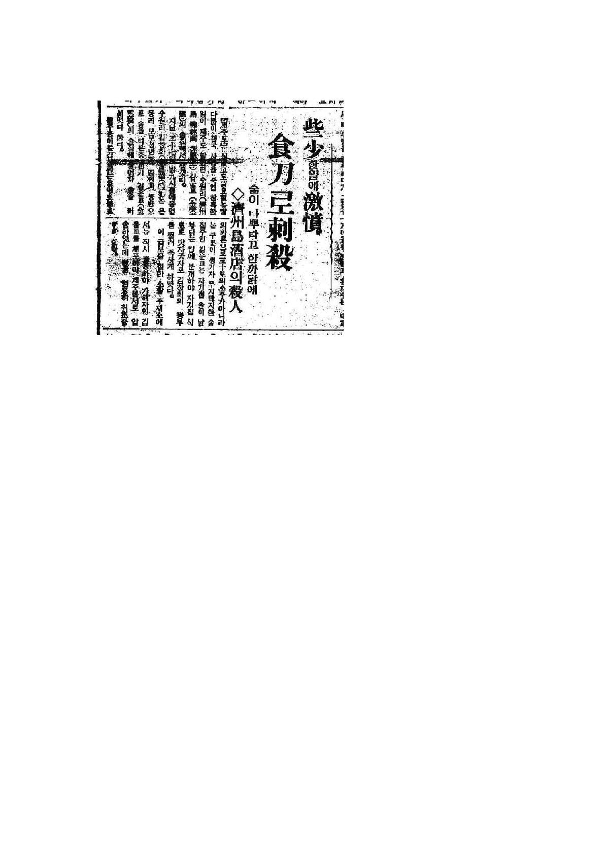 【제주도】 실없고도 필요없는 말다툼이 결국 사람을 죽인 참혹한 일이 제주도 한림면 수원리(濟州島 翰林面 洙原里) 김운교(金雲橋)의 술집에서 생겻다.