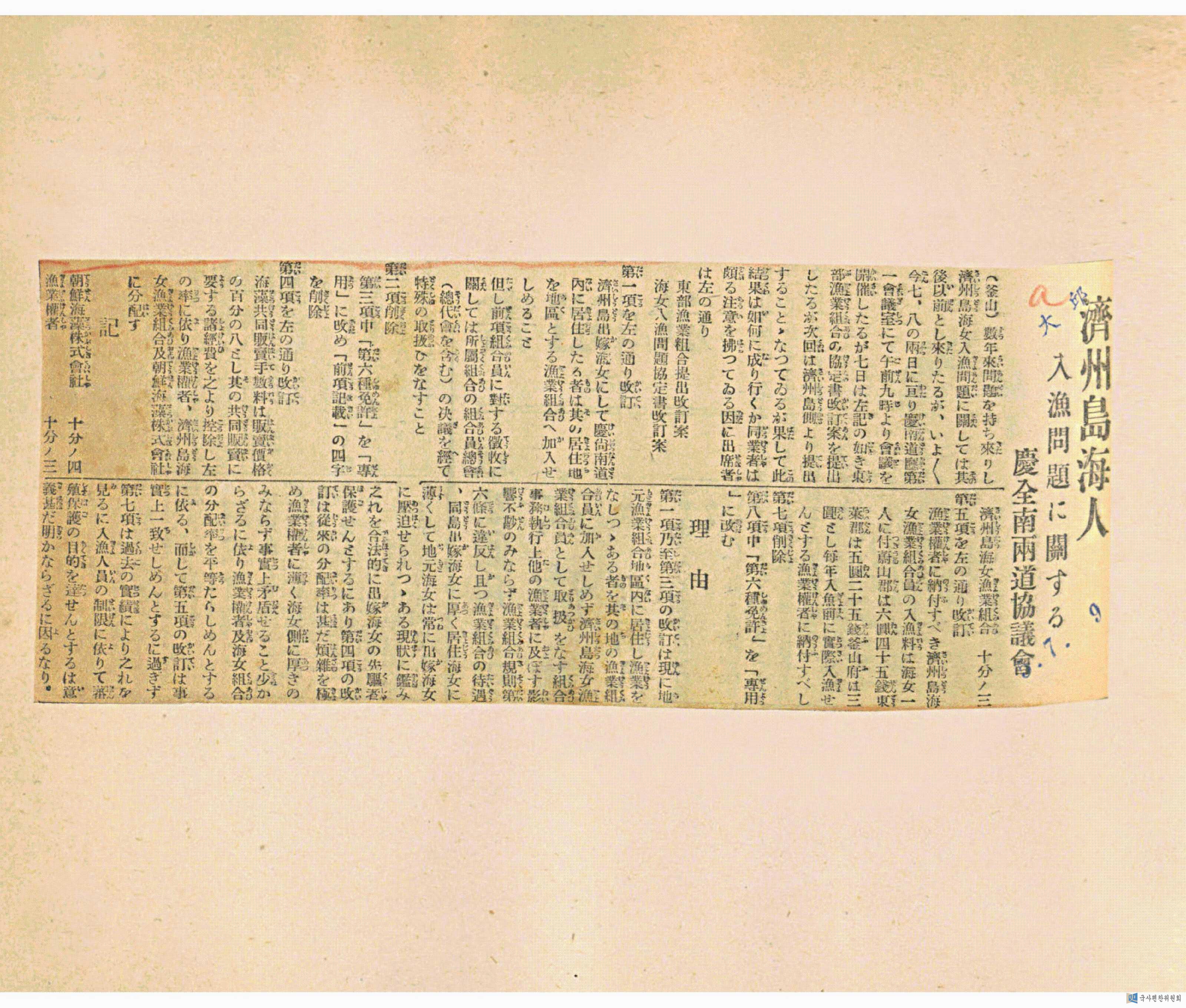 【부산】몇 년째 문제를 지녀 왔고, 제주해녀 입어문제에 관해서는 그 후 이전처럼 해왔는데, 드디어 이번 7,8 일 이틀에 걸쳐 경남도청 제1회의실에서 오전 9시부터 회의를 개최하지만, 7일은 다음과 같이 동부어업조합 협정 개정안을 제출한다. 다음은 제주 도측에서 제출하도록 되어 있지만 과연 이 결과는 어떻고 될 지 동업자는 매우 주의를 기울이고 있다. 이와 관련해서 참석자는 다음과 같이