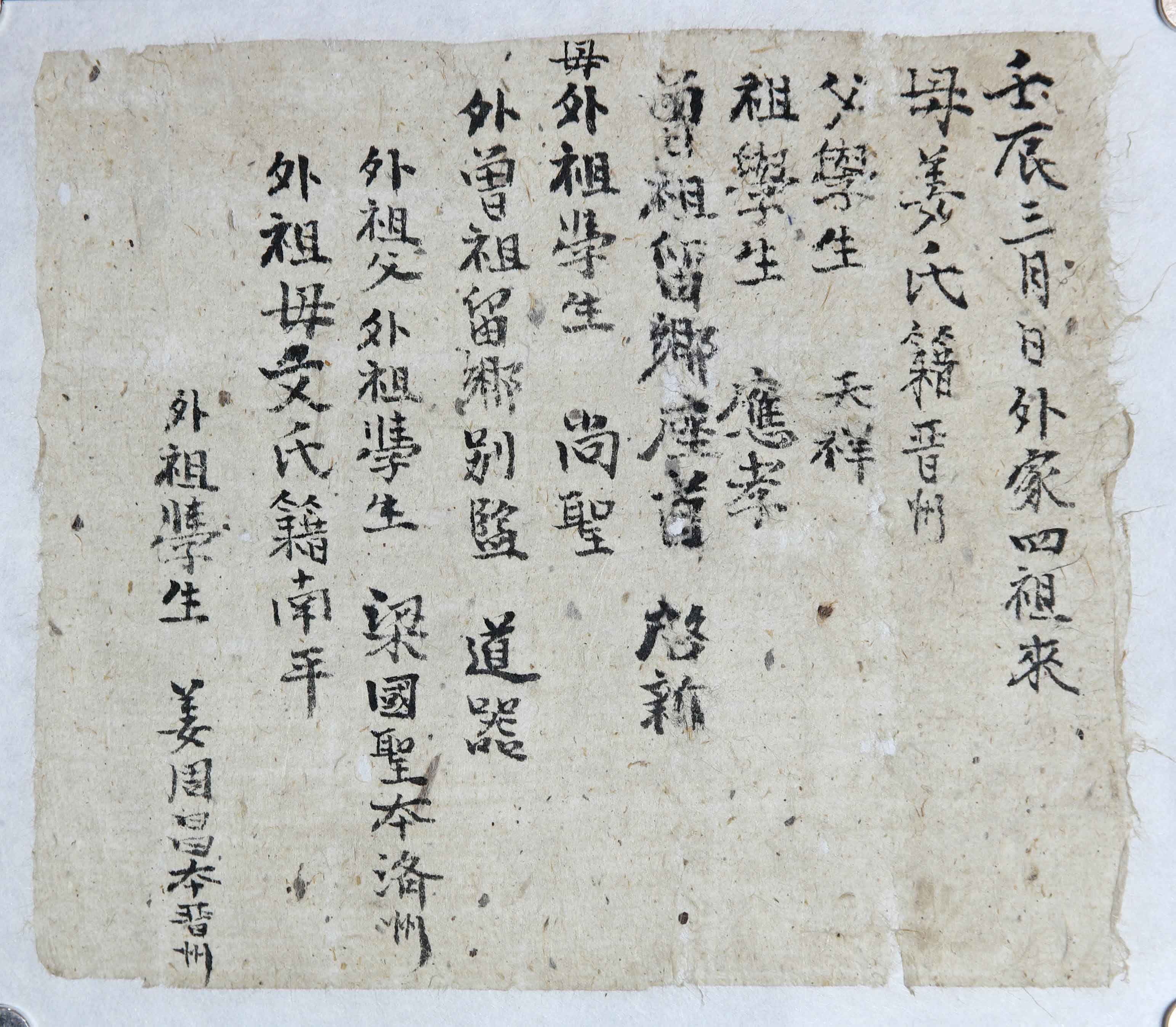 17. 壬辰三月日外家四祖來.母姜氏籍晉州.父學生 天祥.祖學生 應孝.曾祖留鄕座首 啓新.母外祖學生 尙聖. 外曾祖留鄕別監 道器. 外祖父外祖學生 梁國聖本濟州. 外祖母文氏籍南平. 外祖學生 姜周昌本晉州.임진년 3월 일 외가 4조의 내력.어머니 강씨 본적 진주.(어머니의) 아버지 학생 천상. 할아버지 학생 응효. 왕할아버지 유향좌수 계신.어머니의 외할아버지 학생 상성.(어머니의) 외왕할아버지 유향별감 도기. 외조부의 외할아버지 학생 양국성 본관 제주. 외할머니 문씨 본적 남평. 외할아버지 학생 강주창 본관 진주.*이 문서는 양백흥이 외가의 내력을 적은 문서다. 양백흥이 살았던 임진년은 고종 29년(1892)이다.*四祖(사조)는 아버지, 할아버지, 증조할아버지, 외할아버지의 네 조상을 아울러 이르는 말이다. 따라서 ‘外家四祖’라 하면, 어머니의 아버지, 할아버지, 왕할아버지와 어머니의 외할아버지를 이른다.*母姜氏(모강씨)는 양백흥의 어머니며 양제성의 아내다. 마지막에 쓴 ‘外祖姜周昌’은 누구와 어떤 관계에 있는 사람이었을까?