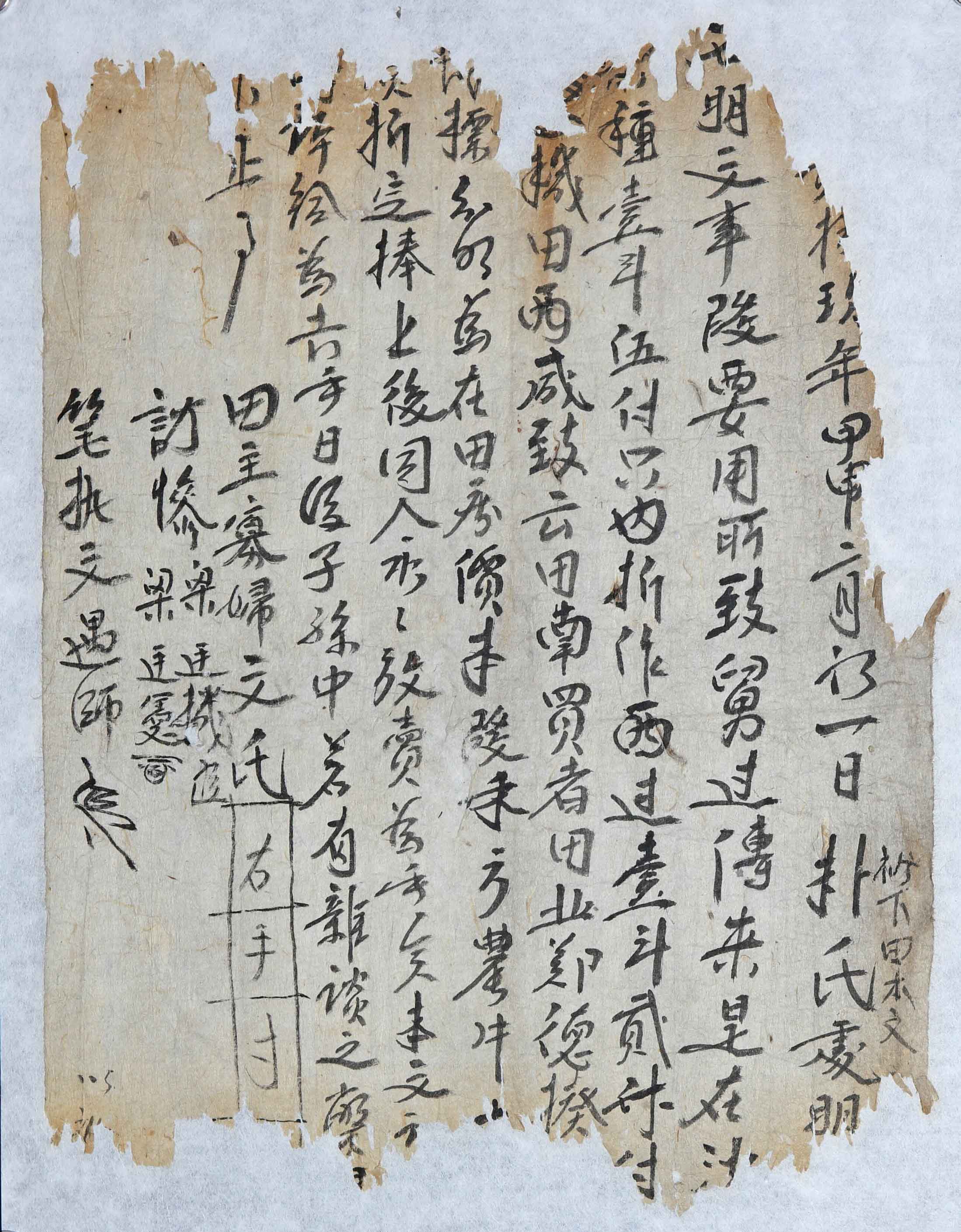 4. 明文(농우의 값으로 농지를 양도한 증명서)(乾隆貳拾)玖年甲申二月初一日朴氏處明(文) 衿下田本文 (右)明文事段 要用所致 舅过傳來是在○[/沙] ○[/粟]種壹斗伍付只內 折作西過[/邊]壹斗貳升付○○機田西咸致云田南買者田北鄭德揆○[/田]○[/肆]標分明爲在田庫 價本段禾方農牛○○○折定捧上後 同人永永放賣爲乎矣 本文○[/記]○○許給爲去乎 日後子孫中若有雜談之弊○ (持此文記告官)○[/卞]正事 田主 寡婦文氏 (右手寸)訂慘 梁廷機 (수결)梁廷憲 (수결)筆執 文遇師 (수결)(건륭 29)년 갑신(영조 40년 1764) 2월 초1일 박씨에게 준 명(문). 깃으로 물려내린 밭 본문(이) 증명서를 준 일은 필요해서 사용할 까닭으로 시아버지로 물려 내려온 [좁]씨 한말닷되지기에서 나누어 농사짓는 서쪽으로 한말두되지기로 [사방 경계표지는 동쪽에] ○○기의 밭 서쪽은 함치운의 밭 남쪽은 사들인 사람[박씨]의 밭 북쪽은 정덕규의 [밭]으로 [사방] 경계표지가 분명한 밭이고 값은 화방농우(禾方農牛) ○○ ○ 판단하여 정하며 값을 받은 후에 이 사람에게 영영 내놓아 팔았으며 이 문[기]와 ○ ○ 허급하오니 일후에 자손 중에 만약 잡담을 하는 폐단이 있으면 (이 문기를 가지고 관청에 알려) [바로잡을] 일이다.밭주인 과부 문씨 (오른쪽 손가락의 마디를 그림)(증)참 양정기 (수결)양정헌 (수결)쓴 사람 문우사 (수결)* 이 문서 첫 줄의 ‘拾玖’는 글자의 일부가 보여서 자형으로 추정이 가능하다. 그래서 康熙(강희) 연간 이후로 19년, 29년, 39년, 49년, 59년 등과 ‘甲申’이 부합되는 해를 찾았더니 ‘乾隆貳拾玖年甲申’이 일치했다.또 2행의 마지막 글자는 일부만 보이는데 ‘沙(모래 사)’ 자로 보인다.