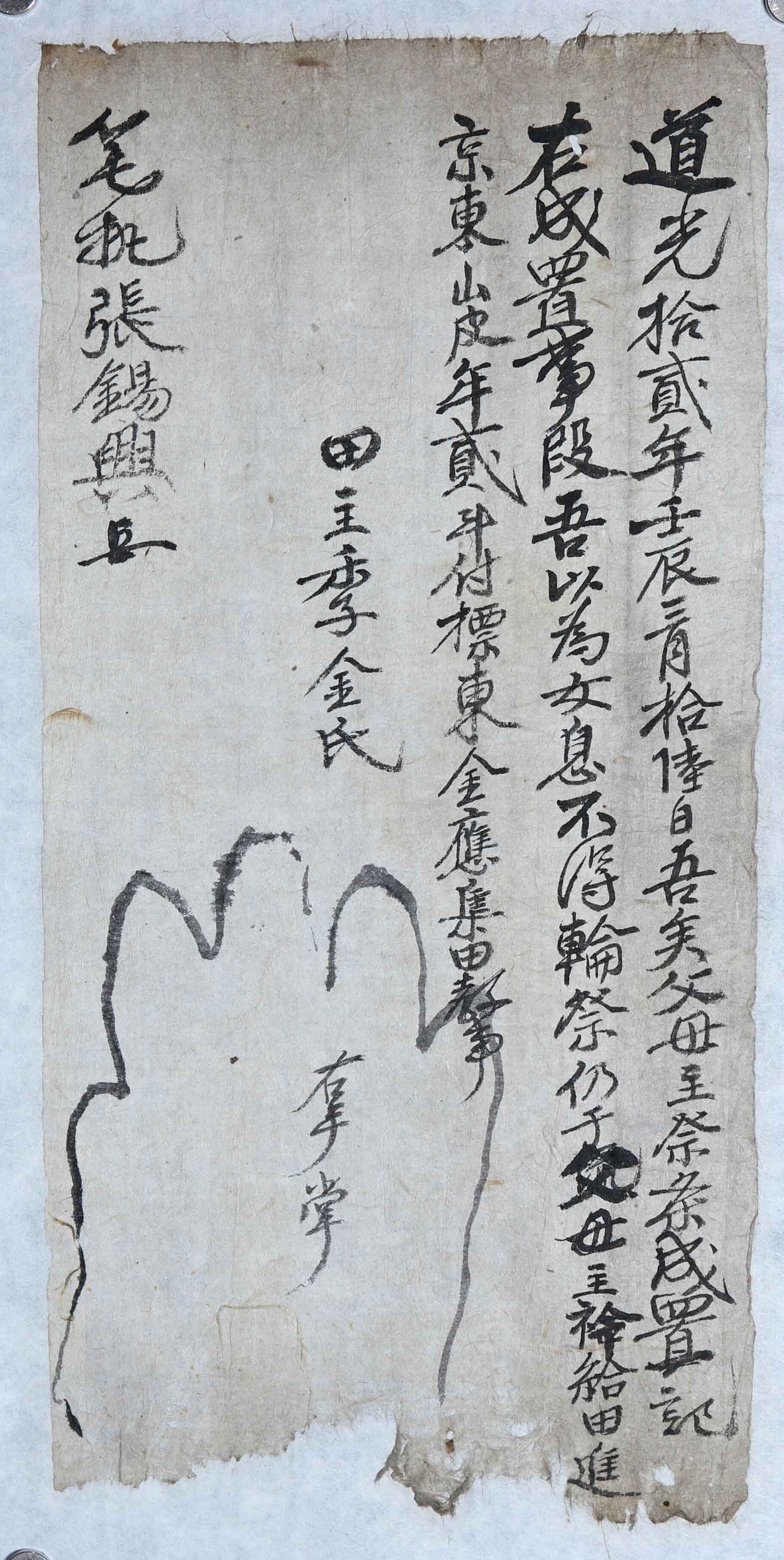 18. 成置記(부모님 제월전을 설정한 문기)道光拾貳年壬辰三月拾陸日吾矣父母主祭条成置記. 右成置事段 吾以爲女息 不得輪祭(乙)仍于 父母主衿給田 進京東山 皮牟貳斗付 標東金應集田□事. 田主 季 金氏 (右手掌)筆執 張錫興 (수결) 양 임진 3월 16일 나의 아버지 제조(제월전) 성치기. 이 성치한 일은 내가 딸이어서 돌아가며 제사를 모시기에 참여치 못하므로 부모님이 몫으로 준 밭인 진경동산에 있는 겉보리 두마지기로 경계는 동쪽에 김응집의 밭이며 □할 일이다. 밭주인 막내 김씨 (오른쪽 손바닥 그림) 쓴 사람 장석흥 (수결) *成置(성치)는 만들어 놓다. 엣 문헌에 ‘노비문기(奴婢文記)를 보건대, 비록 관(官)에서 서명한 것이 아니더라도 재주(財主)가 성치(成置)한 것이 확실[的實]하면 청리(聽理)한다고 하였습니다’ 같은 용례가 보인다. 聽理는 백성끼리의 분쟁을 들어서 그 옳고 그름을 조사하여 처리함을 이른다. *輪祭(윤제)는 교대로 돌아가면서 제사 지내는 것을 이른다. 옛 문헌에 ‘우리나라를 건국하던 초기에 있었던 윤제(輪祭)의 풍속은 종자(宗子)와 지자(支子)의 구분이 너무 없었으니, 진실로 이미 잘못 되었다’, ‘윤제(輪祭)는 고례(古禮)가 아니다. 그리고 지자(支子)는 제사를 못 지내게 되어 있으니, 제사를 지낼 때에는 반드시 종자(宗子)에게 고하는 것이 예라고 하겠다’ 같은 용례가 보인다. *2-3행에 기록한 ‘進京東山(진경동산)’은 지명으로 본다. 그런데 ≪남제주군 고유지명≫ 안덕면 항목에서 ‘진경동산’과 유사하게 발화되는 지명은 보이지 않고, 상창리에 ‘진군으리’라는 지명이 보인다. 진군으리/진군을리[進軍乙伊]. ⦁위치 : 상창리 883번지 일대 남제주군도 가. ⦁유래와 현황 : 이 일대. 그 지형지세가 멀리서 보면 마치 ‘병악(竝岳 골른오름/여진오름 상창리 산 2-1번지)’에 군대가 진을 치고 있다가 ‘군산’을 향해 직렬로 진군하는 형태처럼 보여 연유한 이름. 그러나 이 지명을 ‘進京東山’이라 표기했다고 보이지는 않는다.