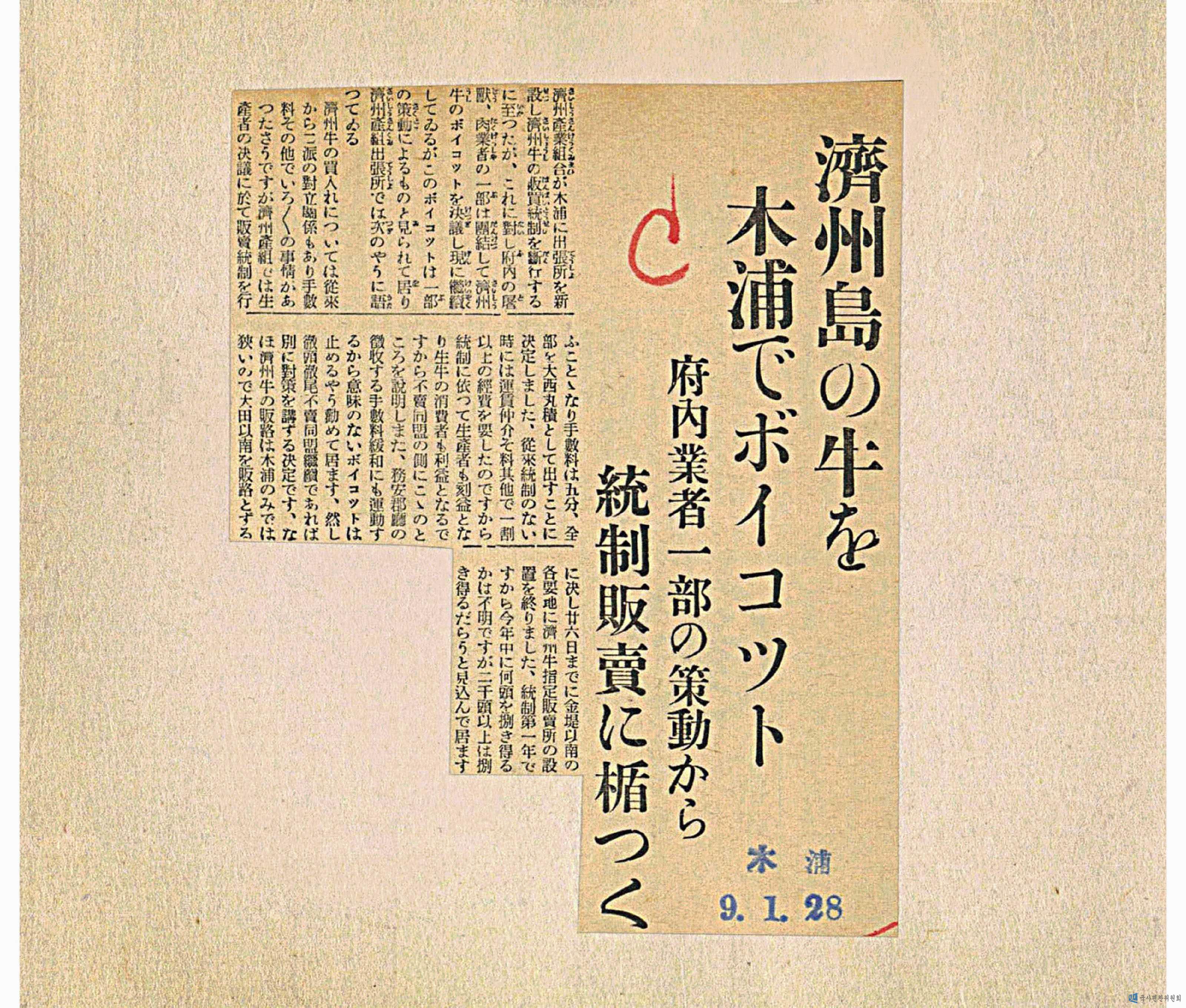 「일제하신문기사」제주도의 소를 목포에서 보이콧 부내업자 일부의 책동에 대해 통제판매로 맞서다 (濟州島の牛を木浦でボイコツト府內業者一部の策動から統制販賣に楯つく)