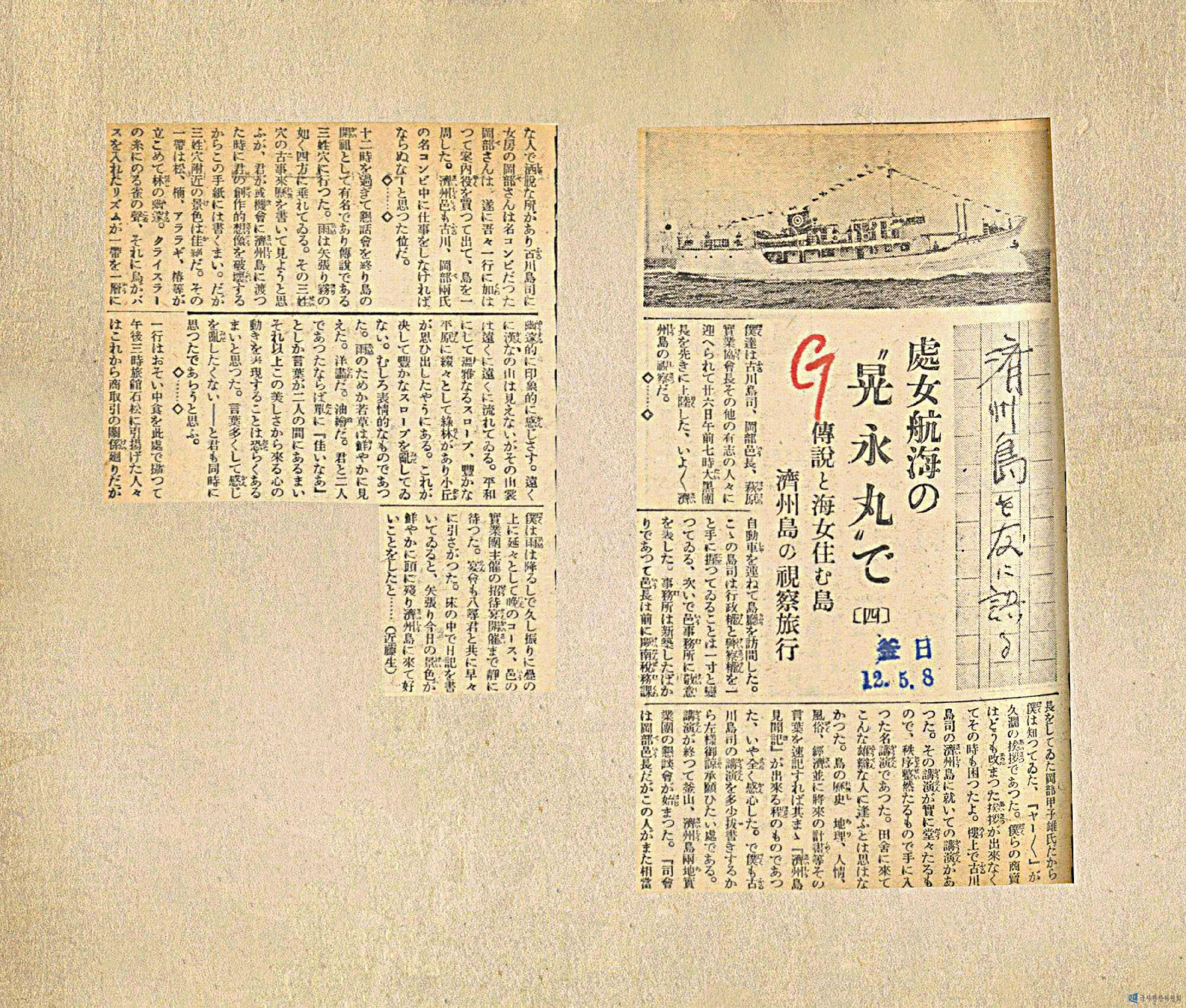 전설과 해녀가 사는 섬 제주도 시찰여행(傳說と海女住む島 濟州島の視察旅行) 우리는 고천(古川)도사(島司), 강부(岡部)읍장, 추원(萩原)실업협회장 그 외 유지들로부터 환영을 받으며 26일 오전 7시 대흑(大黑)단장을 선두로 상륙했다. 드디어 제주도 시찰이다. ◇ 자동차를 늘어세우고 도청을 방문했다. 이곳 도사는 행정권과 경찰권을 동시에 손에 잡고 있는 것은 좀 특이하다. 이어서 읍사무소에서 경의를 표했다. 사무소는 막 신축한 것으로 읍장은 전에 경남세무과장을 지낸 강부갑자웅(岡部甲子雄) 씨여서 나는 알고 있었다. ‘야~’가 격조의 인사였다. 우리들 직업은 아무리해도 격식 차린 인사를 못해서 그 때도 곤란했어. 루(樓) 위에서 고천(古川) 도사가 제주도에 대해서 강연을 했다. 그 강연이 실로 당당하고 질서정연한 것으로 숙달된 명 강연이었다. 시골에 와서 이런 웅변가를 만날 것이라는 생각은 못했다. 섬의 역사, 지리, 인정, 풍속, 결제 및 장래의 계획 등 그 말을 속기하면 그대로 제주도 견문기가 될 정도의 것이었다. 아니 완전히 감동받았다. 그래서 나도 고천(古川) 도사의 강연을 다소 발췌할 것이므로 그렇게 양해를 바라고 싶은 것이다. 강연이 끝나고 부산, 제주도양지역 실업단의 간담회가 시작되었다. 사회는 강부(岡部)읍장이었는데 이 사람이 또 상당한 사람이어서 소탈한 부분이 있어서 고천(古川)에게 내조자인 강부(岡部) 씨는 명 콤비였다. 강부(岡部) 씨는 곧 우리 일행과 합류해서 안내역을 자진해서 맡았고 섬을 일주했다. 제주읍도 고천(古川), 강부(岡部) 양 씨의 명콤비 안에서 일을 하지 않으면 안 되겠다고 생각할 정도였다. ◇ 12시를 지나서 간담회를 끝내고 섬의 시조로 유명한 전설을 갖고 있는 삼성혈에 갔다. 비는 역시 안개처럼 사방에서 내리고 있었다. 그 삼성혈의 전해온 내력을 써보려고 했지만 자네가 또 다른 기회에 제주도에 올 때에 자네의 창작적 상상을 파괴할 것이므로 편지에는 쓰지 않겠네. 그러나 삼성혈 부근의 경치는 더할 나위 없이 좋다. 그 일대는 소나무, 녹나무, 주목, 동백나무 등이 군집되어 숲을 이룬다. 크라이슬러의 길고 긴 참새의 울음소리, 거기에 새가 베이스를 넣은 리듬이 일대를 한층 유수적이고 인상적인 느낌을 준다. 멀리 한라산은 보이지 않지만 그 산의 정상은 멀리 멀리 흐르고 있다. 평화롭고 온아한 비탈, 풍부한 평원에 넓은 녹림이 있으며 작은 언덕이 회상하듯 있다. 이것이 결코 풍부한 비탈을 흐트러트리고 있지 않다. 오히려 표정적인 것이었다. 비 때문에 어린 풀은 선명히 보였다. 서양화다. 유화다. 자네와 둘이서 있었다면 단지 ‘좋구나’ 라는 말만이 있었을 것이다. 그 이상 이 아름다움에서 오는 마음의 동요를 표현하는 것은 아마도 불가능할 것이라고 생각했다. 말이 많아서 느낌을 방해하고 싶지 않다―라고 자네도 동시에 생각했을 거라고 생각한다. ◇ 일행은 늦은 점심을 여기서 먹고 오후 3시에 여관 석송으로 철수한 사람들은 지금부터 상거래 관계의 순회인데, 나는 비는 오지만 다다미 위에서 오랜만에 밤 코스, 읍의 실업단 주최의 초대연 개최까지 조용히 기다렸다. 연회도 팔등신(八尋君やひろきみ)들과 함께 빨리 물러났다. 침대위에서 일기를 쓰고 있자니 역시 오늘 경치가 선명히 머리에 남아 제주도에 와서 좋은 일을 했다고……(근등생(近藤生))※고천(후루카와, 古川)※..