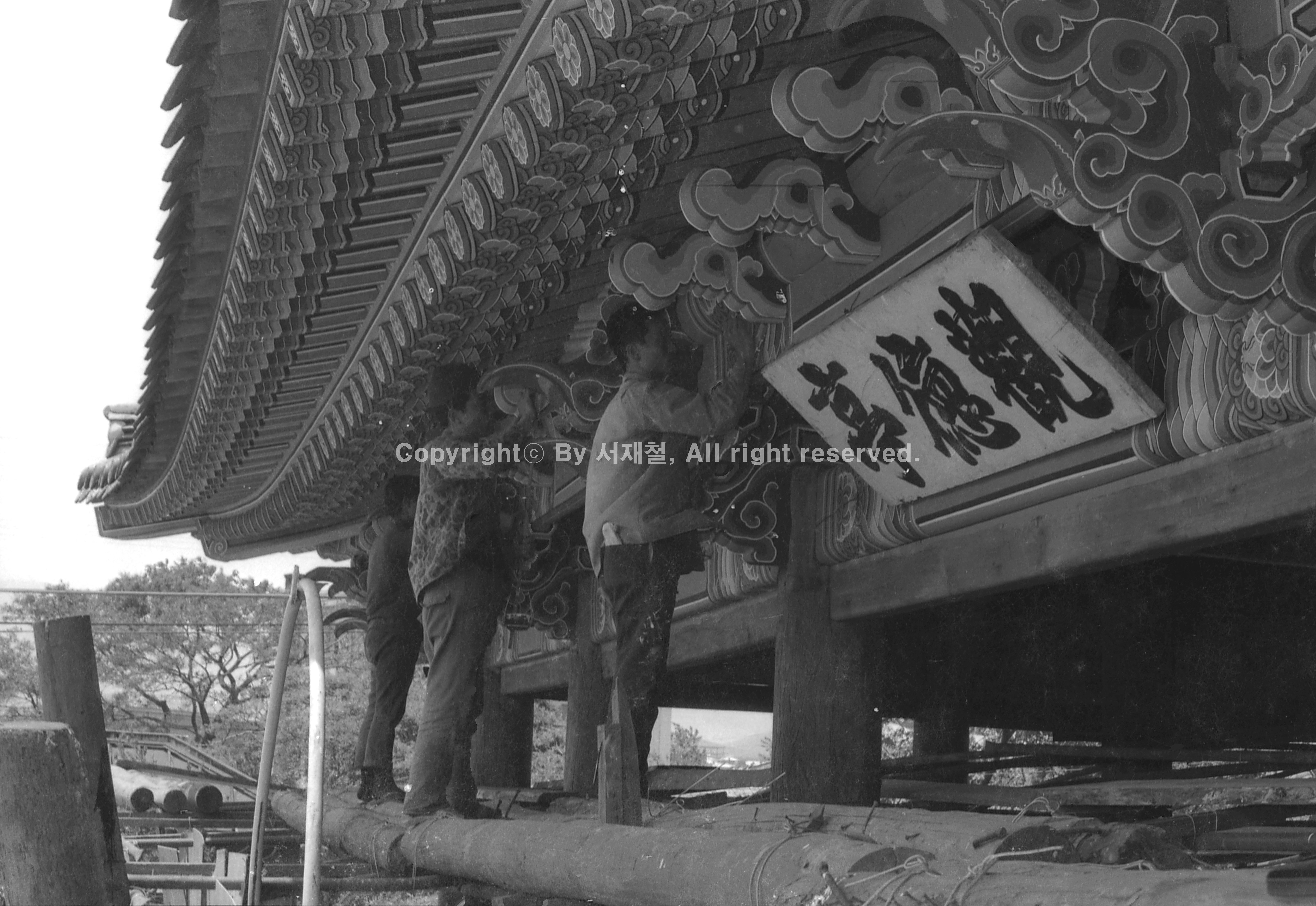 관덕정 보수공사 모습이다. 관덕정은 조선시대 정자 건물로 제주를 상징하는 건물이다. 1963년 보물 제322호로 지정됐고, 건물 벽면에는 상산사호(商山四皓), 취과양주귤만교, 적벽대첩도, 홍문연도, 진중서성탄금도, 대수럽도, 십장생도, 삼고초려도 등의 벽화가 그려져 있다. 일제강점기에 중수하면서 15척이나 되는 처마를 2척이나 줄였고, 해방 후인 1969년에 건물을 보강 수리하였다.